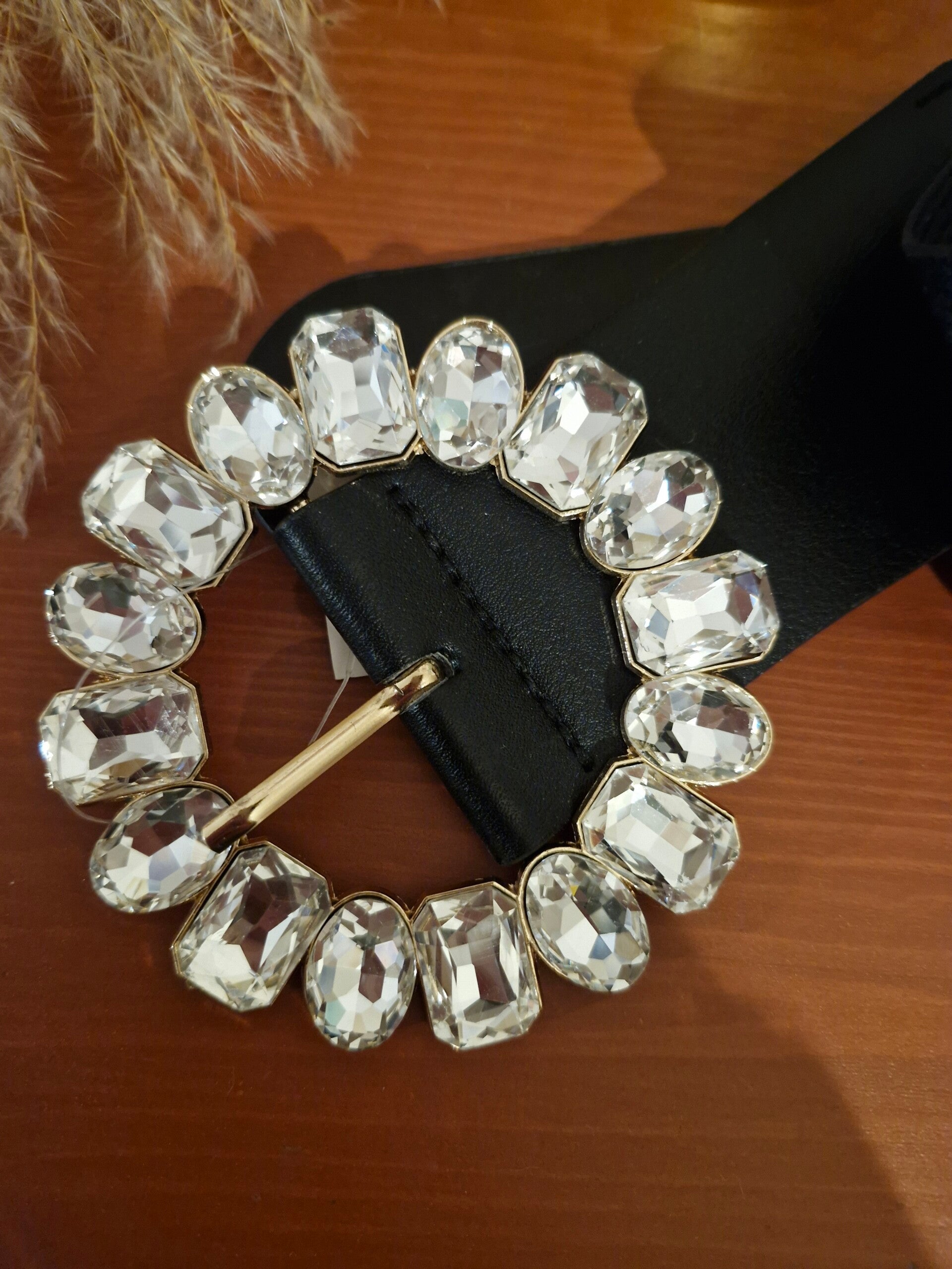 De ronde gesp versierd met strass zorgt voor een stijlvolle glans, perfect om zowel een elegante jurk als een meer casual look te verfraaien.