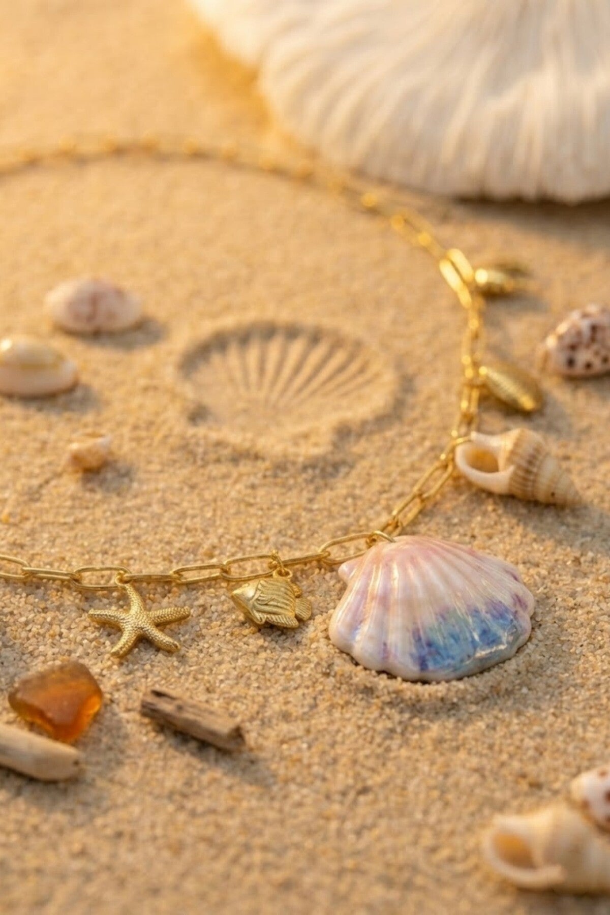 Een trendy ketting in strandstijl, verfraaid met een geëmailleerde schelp en goudkleurige hangertjes. Ideaal voor een zomerse en bohemian look. Roestvrij staal – waterbestendig – moderne schakelketting