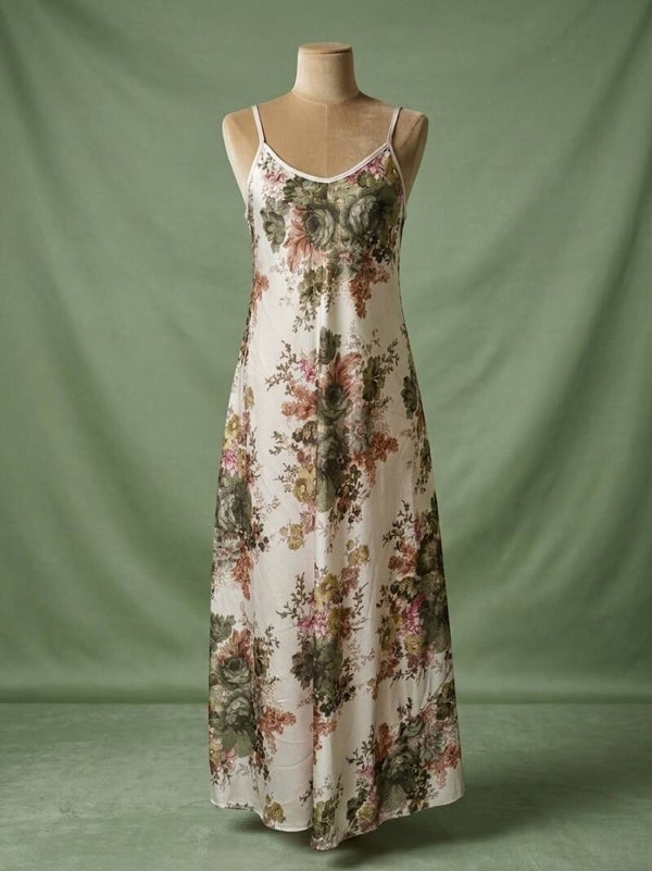 Lange jurk met fijne bandjes, gemaakt van een lichte en luchtige stof die elegant en vloeiend valt. De artistieke print combineert verschillende kleurnuances en creëert zo een originele en verfijnde visuele uitstraling. De subtiel afgewerkte rechte halslijn voegt een elegante touch toe, terwijl de losse snit zorgt voor comfort en volledige bewegingsvrijheid.
